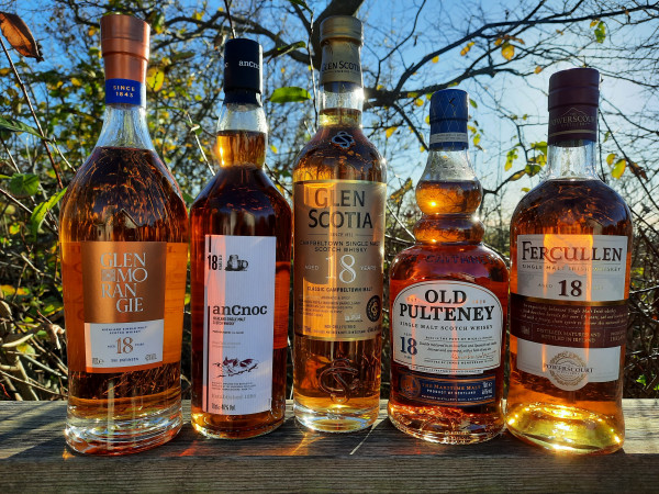 I första glaset fanns Glenmorangie 18 år 43% till priset av 1259:-. Lagringen sker mest i bourbonfat men också en del sherryfat.